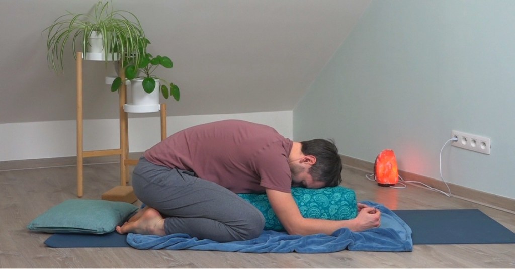 – held for a long time, while still, 3 to 5 minutes. We use cushions and blocks to prop ourselves up and find a comfortable position which is the right stretch.